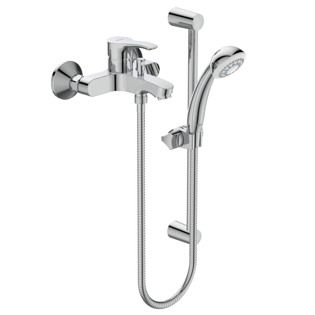 Настенный смеситель для ванны/душа с принадлежностями • 35-миллиметровый керамический запорный механизм с ограничителем горячей воды • Металлическая ручка с индикатором горячей и холодной воды • Обратный клапан • Стандартное соединение с S-образными держателями • Аэратор-перлатор • Автоматический распределитель • Соответствует стандарту EN817 Аксессуары: • Подвеска для трубы 600 мм • Однофункциональный ручной душ • Металлический шланг с двойной оплеткой 1500 мм