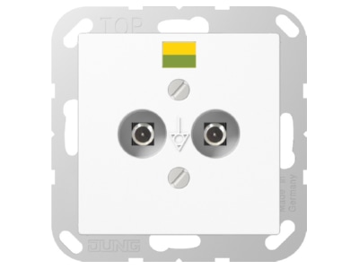 Розетка для выравнивания потенциалов, 2 вилки — Заземляющая розетка A 565-2 WW – Jung – 4011377041455: Вариант: Двухрозеточная розетка, Тип монтажа: Встраиваемый, Материал: Пластик, Качество материала: Дюропласт, Без галогенов: да, Защита поверхности: без обработки, Вариант поверхности: глянцевый, Цвет: альпийский белый, Номер RAL (аналогичный): 9016, Прозрачный: нет