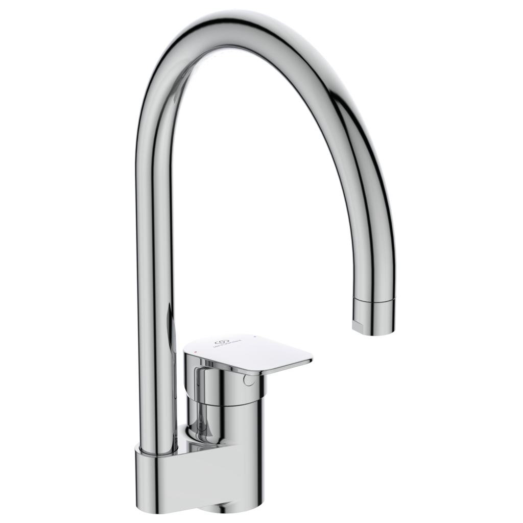 Смеситель для кухни Ceraplan с высоким изливом • Корпус и излив из латуни R200 с высотой под аэратором 180 мм • Керамический запорный механизм FirmaFlow® 28 мм с ограничителем горячей воды и Click • Самоочищающийся аэратор из силикона • Соединение Easy-Fix • Гибкие соединения G3/8”.