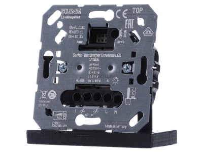 Универсальный светодиодный сенсорный диммер — Универсальный светодиодный сенсорный диммер 1712DE — Jung — 4011377166929: Универсальный светодиодный кнопочный диммер JUNG LED серии 1712DE с дополнительным входом представляет собой универсальный диммер для точного управления и диммирования современного освещения. Два независимых выхода позволяют раздельно управлять двумя группами светильников. Благодаря автоматическому или ручному выбору соответствующего принципа диммирования, устройство подходит для многих распространенных типов нагрузок и обеспечивает комфортную и безопасную работу благодаря плавному пуску, памяти яркости и защитным функциям. Точное управление освещением для двух групп светильников с помощью универсального кнопочного диммера JUNG LED 1712DE. Диммер предназначен для установки в монтажные коробки, соответствующие стандарту DIN 49073, и может работать в режиме фазового сдвига (восходящего или нисходящего). Это позволяет адаптировать управление освещением к подключенной нагрузке. Светодиодный индикатор четко отображает выбранный режим работы. Эта модель особенно подходит для жилых и коммерческих помещений благодаря своей гибкости в использовании, высокой совместимости и возможности работы без нейтрального провода. Основные характеристики и преимущества продукта: Два отдельных выхода: Идеально подходит для двух групп светильников в одном помещении. Универсальный принцип диммирования: Автоматический или ручной выбор фазового управления подъемом и спадом. Совместимость со светодиодами: Разработан для широкого спектра диммируемых светодиодных источников света и других типов нагрузок. Дополнительный вход: Удобная интеграция дополнительных точек управления. Плавный пуск: Мягкий запуск лампы для повышения комфорта в повседневной жизни. Память яркости: Запуск с последнего использованного или постоянно сохраненного значения яркости. Сохраняемые пороговые значения: Минимальная и максимальная яркость могут быть сохранены навсегда. Возможность использования без нейтрального провода: Упрощает модернизацию во многих существующих установках. Асимметричное распределение нагрузки: Гибкое использование с выходами с различной нагрузкой. Защита от перегрузки: Электронная защита от короткого замыкания и перегрева повышает безопасность. Тестовый режим: Практическая функциональная проверка во время ввода в эксплуатацию и обслуживания. Расширяемость: Мощность может быть увеличена с помощью соответствующих силовых модулей. Технические характеристики вкратце: Характеристики Спецификация Производитель JUNG Название изделия JUNG LED универсальный последовательный кнопочный диммер с дополнительным входом 1712DE Номер изделия производителя 1712DE EAN 4011377166929 Каталог Диммеры Серия LB-Management Тип изделия Последовательный кнопочный диммер Конфигурация Основной элемент Способ управления Кнопочный Номинальное напряжение переменного тока 230 В Частота сети 50/60 Гц Метод диммирования Фазовое управление подъемом и спадом Тип нагрузки универсальный Последовательный диммер да Дополнительный вход да Память значений освещенности да Плавный пуск да Работа без нейтрального провода да Светодиодный дисплей да Возможность использования с кнопкой да Возможность использования с датчиком движения да Возможность использования с датчиком 